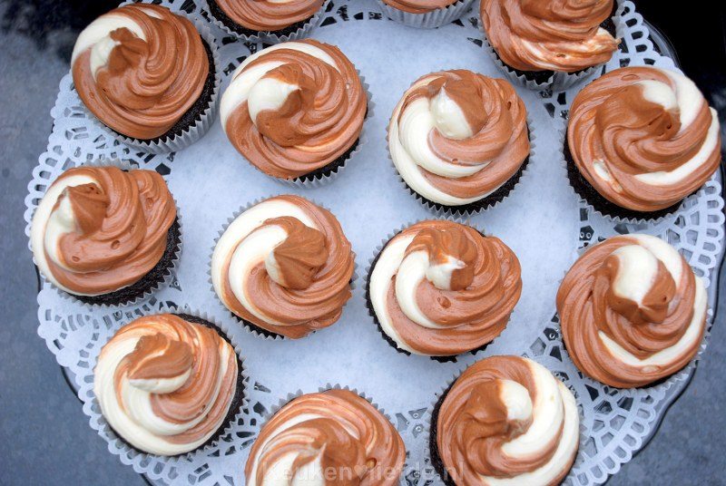 Doe de toffee in de spuitzak en trek één uiteinde van de folie door de spuitzak (laat, in tegenstelling tot wat je ziet op onderstaande foto, de spuitmond erop zitten). Knip het uitstekende stuk folie af en spuit met een draaiende beweging de botercrème op de cupcakes.