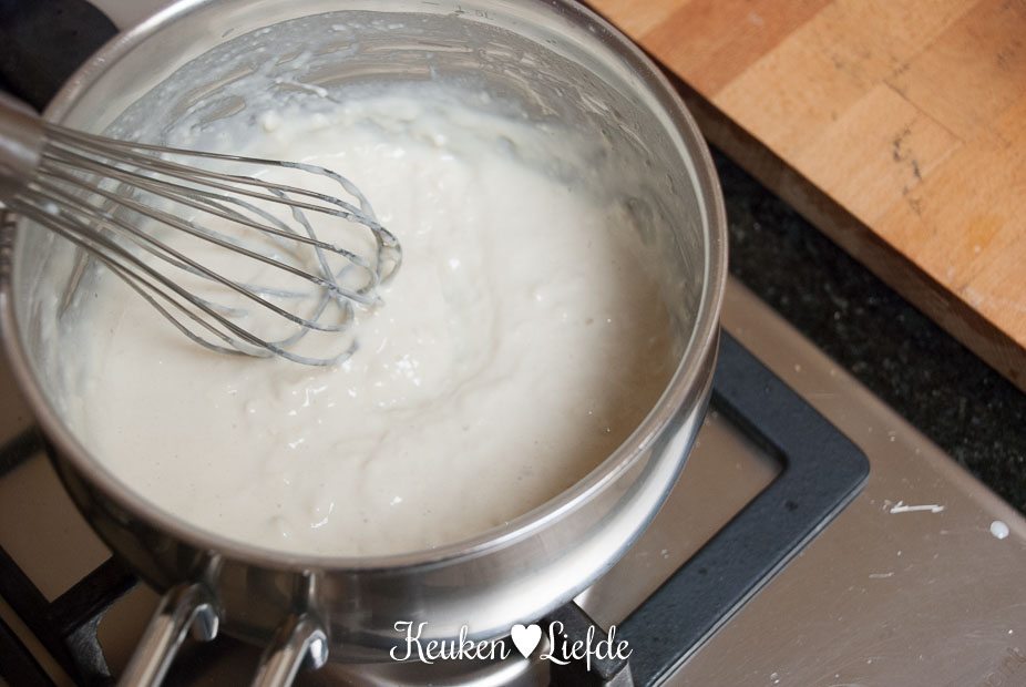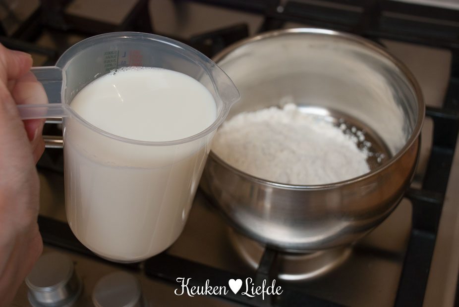 Zeef de bloem boven het sauspannetje en voeg in een klein straaltje, al kloppend met een garde, de melk toe, zodat er geen klontjes ontstaan. Klop net zolang totdat alle klontjes verdwenen zijn. Verwarm het mengsel op laag tot middelhoog vuur, totdat het mengsel begint te binden en zet het vuur laag. Warm nog kort even door, zodat de bloem goed kan garen. Zet het vuur uit en laat het mengsel afkoelen. Dek af met vershoudfolie, zodat er geen velvorming kan ontstaan.