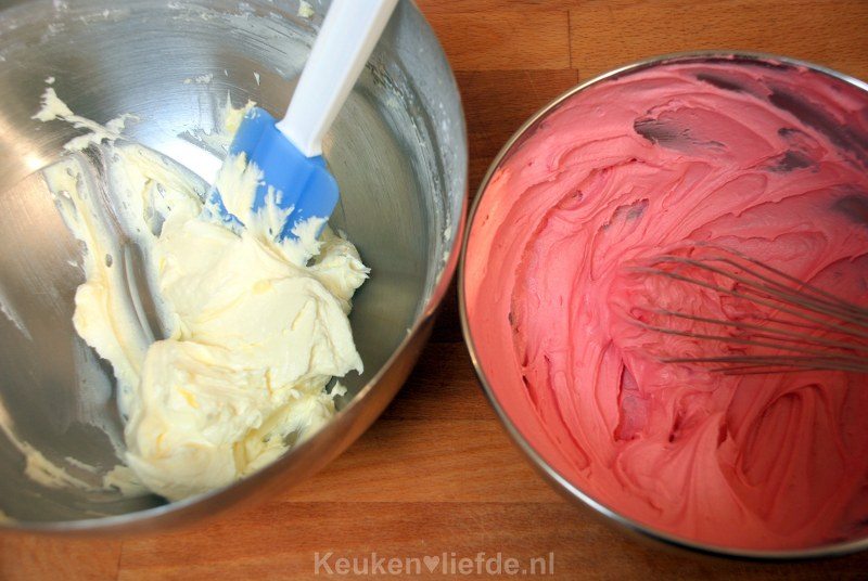Klop een basis botercreme van 200 g zachte roomboter en 100 g poedersuiker. Meng hier een portie banketbakkersroom doorheen van Dr. Oetker (gemaakt volgens de omschrijving op het pak).