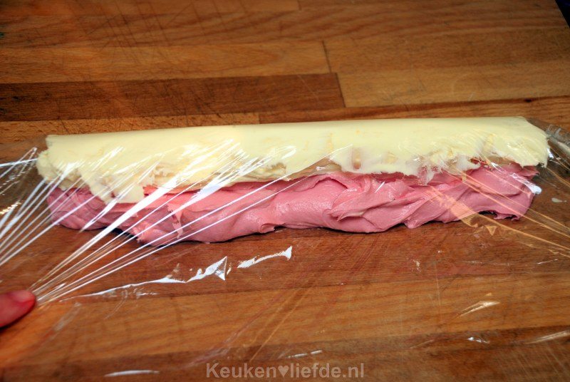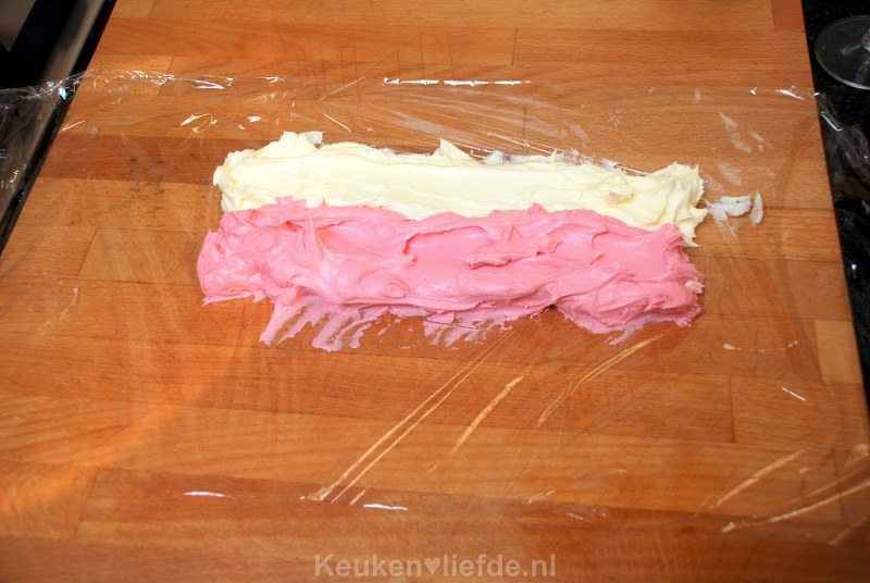 Verdeel de basis botercrème in twee helften en roer door de ene helft een druppel levensmiddelenkleurstof, of 90 gram gesmolten pure chocolade. Spreid een groot stuk vershoudfolie over het aanrecht of tafel en verdeel de beide botercrèmes in een lange streep naast elkaar, op de folie. Rol de folie zo strak mogelijk op en draai beide uiteinden als een toffee dicht.