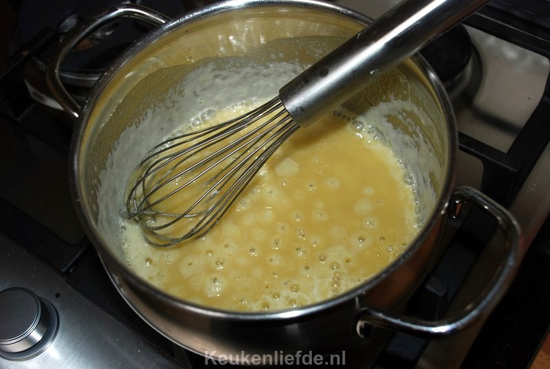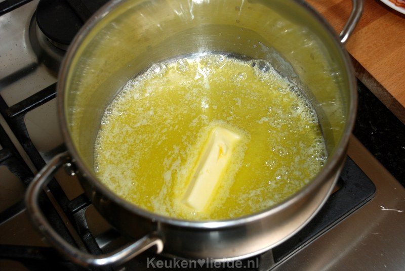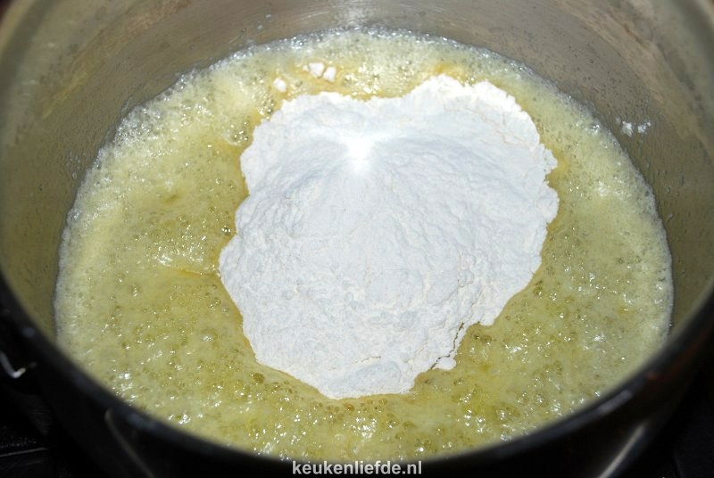 Laat de roomboter rustig smelten zonder te kleuren en voeg dan de bloem toe.