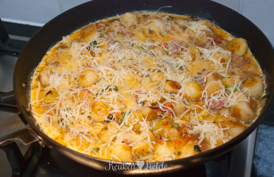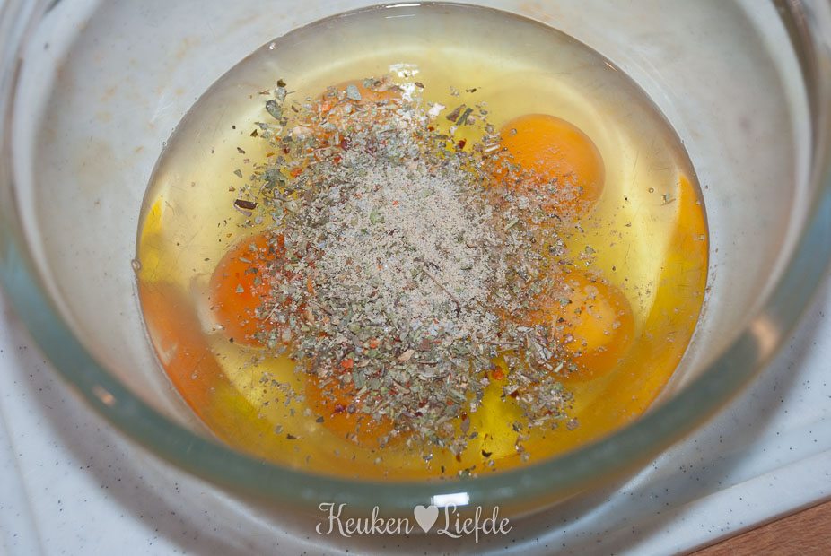 Voeg de soepgroenten weer toe en roer alles door elkaar. Klop de eieren lichtjes los (niet te hard of te lang kloppen) en breng op smaak met de Italiaanse kruiden en zout en peper. Schenk het eimengsel over de krieltjes en bestrooi met de geraspte kaas.