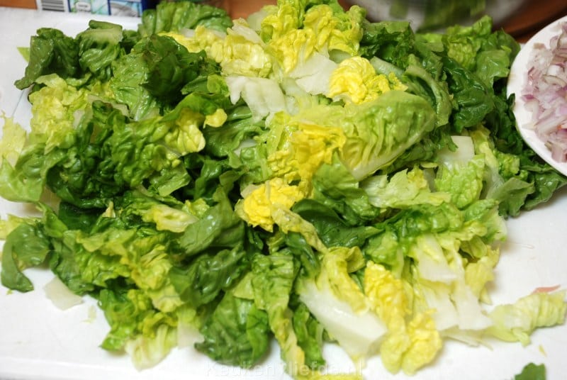 Trek de bladeren van de sla los en was grondig. Dep ze voorzichtig droog op een theedoek en snijd in stukken.