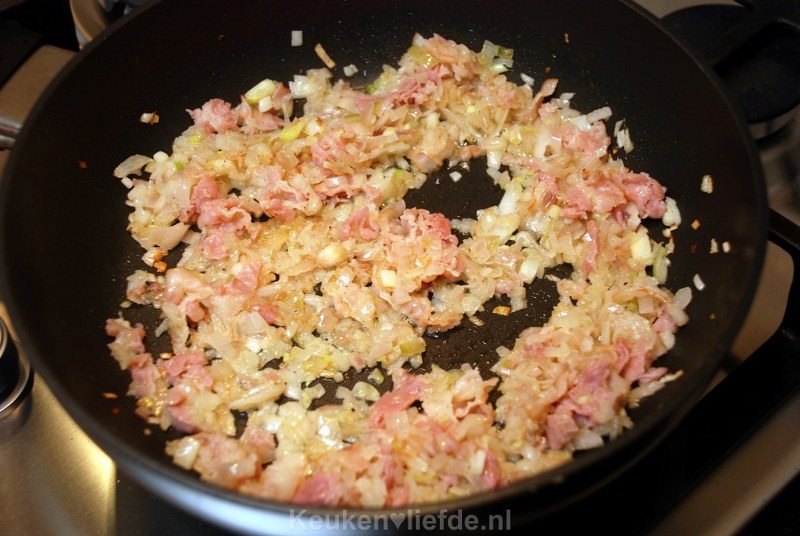 Verhit een grote koekenpan met de boter en voeg de sjalotten toe. Fruit ze op laag vuur totdat ze zacht maar niet gekleurd zijn. Voeg het ontbijtspek toe en bak verder totdat het spek zijn vet loslaat en begint te kleuren.
