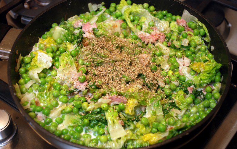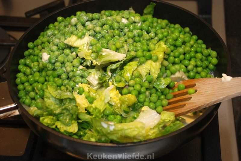 Zet het vuur hoger en voeg de doperwten en room toe. Kook op hoog vuur verder totdat de room iets is ingedikt en de erwten bijna beetgaar zijn. Voeg de sla toe en smoor mee totdat deze geslonken is.