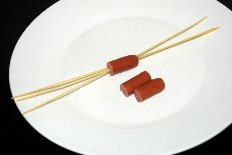 Snijd de knakworstjes in middelgrote stukjes en laat je kinderen de gedroogde spaghetti erdoor prikken.