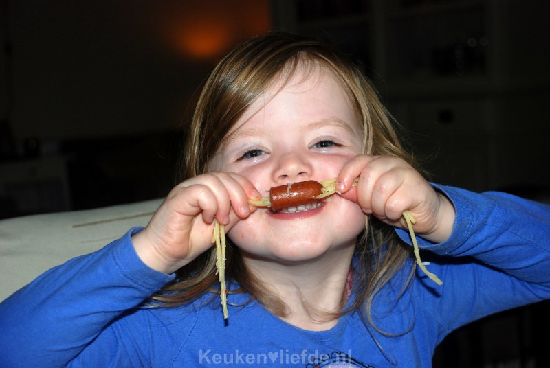 Dit is een leuk recept om kinderen te laten maken tijdens bijvoorbeeld een verjaardagsfeestje. Zet ze allemaal aan een tafel en laat ze zelf de spaghetti door de knakworstjes prikken. Kinderen vinden dit fantastisch leuk om te doen evenals het opeten ervan!