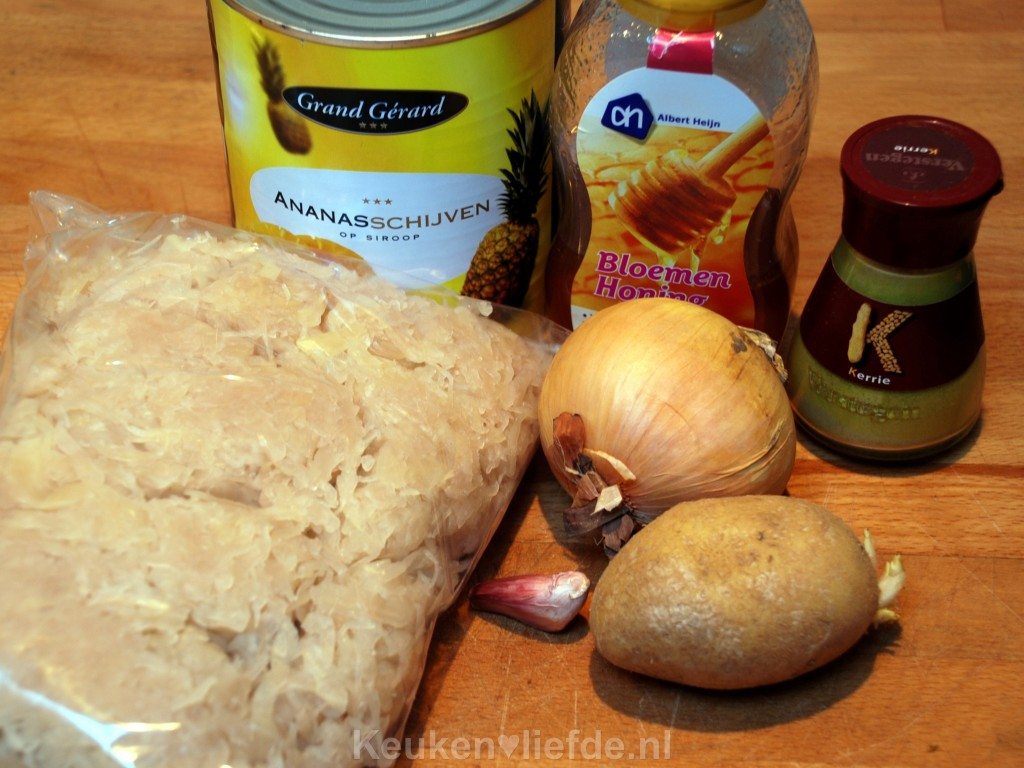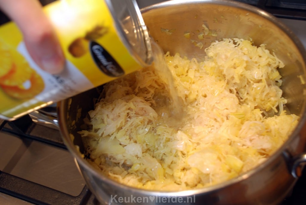 Je kunt ook appelsap gebruiken, maar ik zou toch voor ananassap gaan. Je proeft er later niets van terug. Het zorgt er alleen voor dat de zuurkool milder en minder zuur smaakt.
