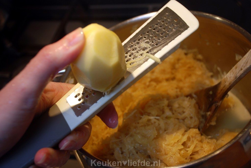 Schil de aardappel en rasp hem heel fijn. Roer de aardappel de laatste 10 minuten van de bereidingstijd door de zuurkool.