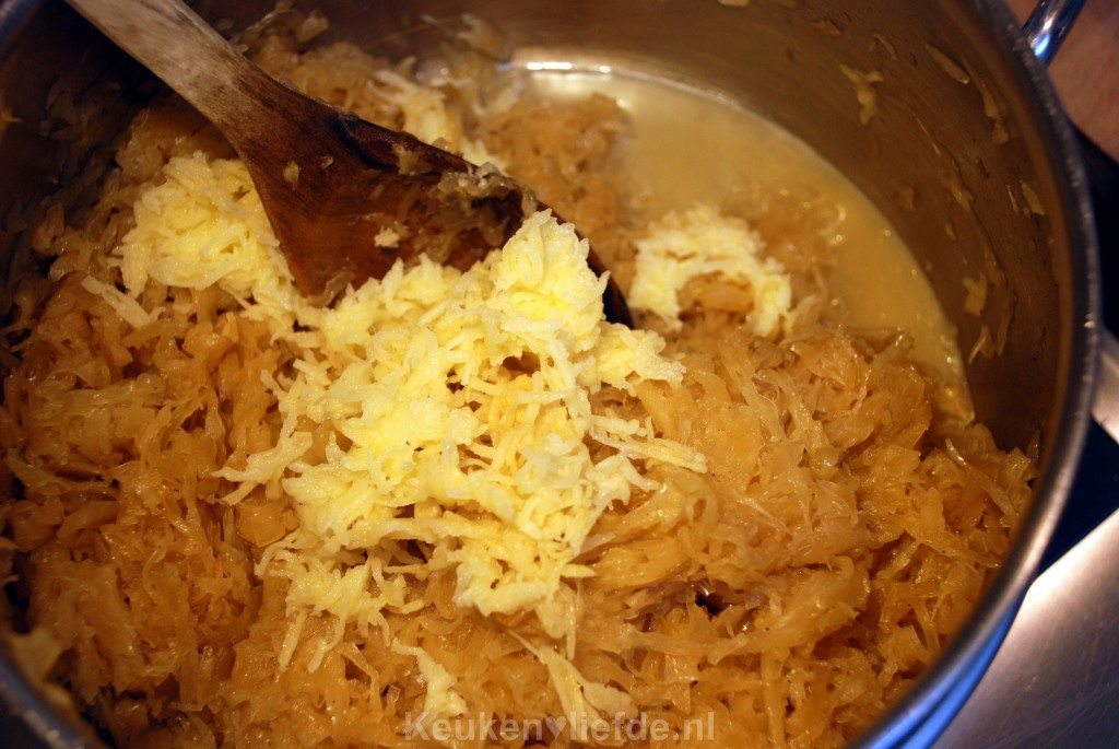 De aardappel zorgt voor een mooie binding en maakt de zuurkool fluweelzacht van smaak en ongelofelijk smeuïg.