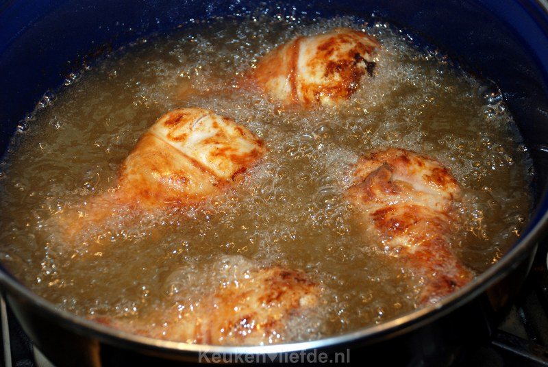 Laat 12-24 uur marineren. Haal de kip ruim van tevoren uit de koelkast en laat op kamertemperatuur komen. Verhit de olie in een frituurpan of grote braadpan tot 180 graden.