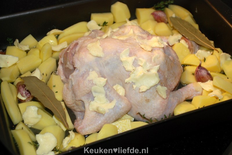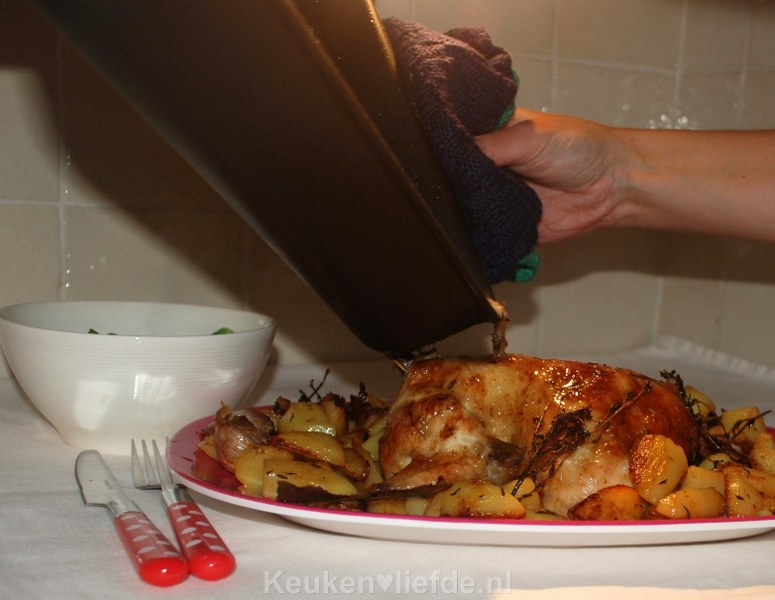Een klein beetje water, wijn of bouillon is wel een goed idee om toe te voegen. Je hebt namelijk wat vocht nodig om de kip te bedruipen.