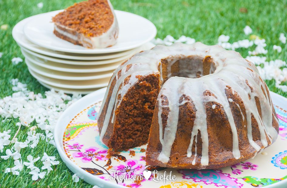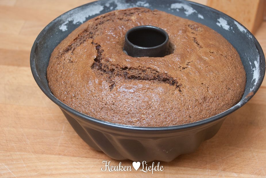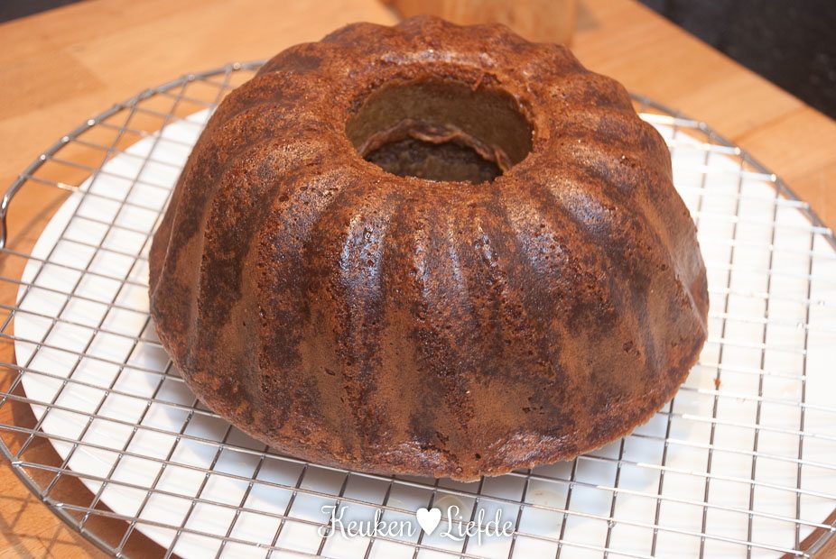 Schep het beslag in de bakvorm en bak circa 40 minuten in de oven (bij mij was hij na 35 minuten al gaar), totdat hij goudbruin is en een houten prikker er droog uit komt. Zet de bakvorm op een rooster en laat 10 minuten in de vorm afkoelen.
