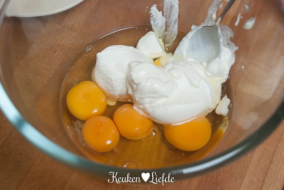 Klop in een andere kom de eieren, eidooier en zure room los. Zet opzij.