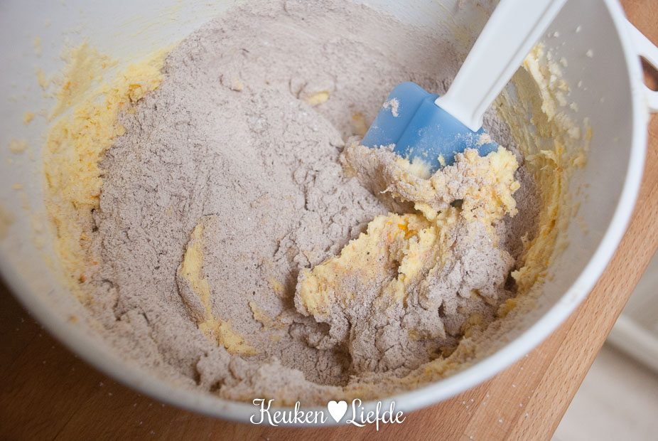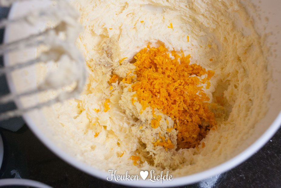 Mix in een ruime kom de boter en suiker tot een romig en bijna wit geheel, dit duurt circa 3 minuten.