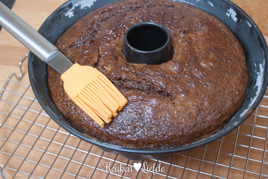 Maak ondertussen de siroop. Kook de bourbon en suiker circa 4 minuten in een kleine pan, totdat er ongeveer 80 ml over is. Smeer de helft van het bourbonmengsel met een kwastje over de bovenkant van de cake. (Dit wordt later de onderkant.) Laat het mengsel enkele minuten inweken en verwijder de vorm. Draai de cake vervolgens om op het rooster. Smeer het overige bourbonmengsel over de hele koek.