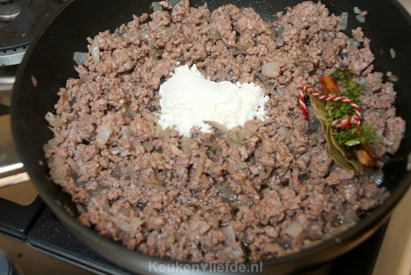 Voeg de bij elkaar gebonden kruiden, suiker, oregano en 1 eetlepel bloem toe en bak even mee om de bloem te laten garen.
