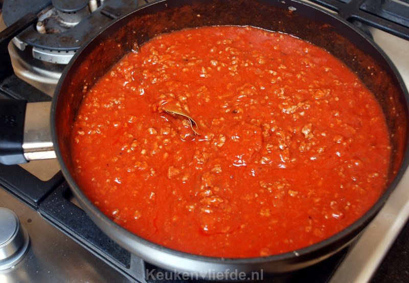 Voeg tot slot de gezeefde tomaten toe en breng goed op smaak met peper en zout. Zet op het allerlaagste (sudder) pitje en laat het gehakt heel zacht worden (dit kan makkelijk een uur duren). Voeg als de saus te dik wordt en het gehakt nog niet zacht is, een extra scheutje water toe.