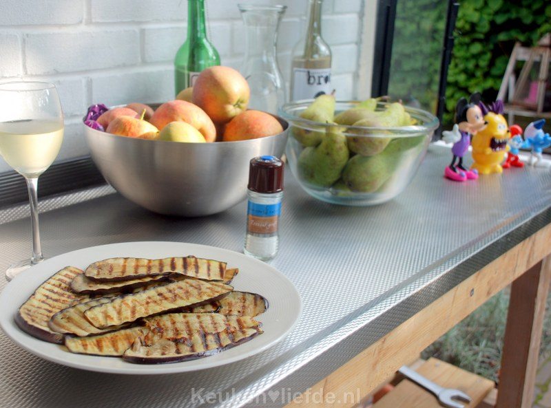 Verhit ondertussen de grillpan en laat heel heet worden. Bestrijk de plakken aubergine met olie en grill ze aan beiden kanten in de hete grillpan, totdat ze donkere grillstrepen hebben. Leg de aubergines op een bord en bestrooi met wat gemalen zeezout. Herhaal dit net zolang, totdat alle aubergines gegrild zijn. Omdat het heerlijk weer is neem ik de grillpan lekker mee naar buiten en grill de aubergines op het elektrische kookplaatje in onze buitenkeuken. Wijntje erbij, dochterlief is lekker aan het keutelen: genieten!