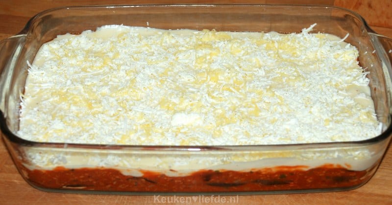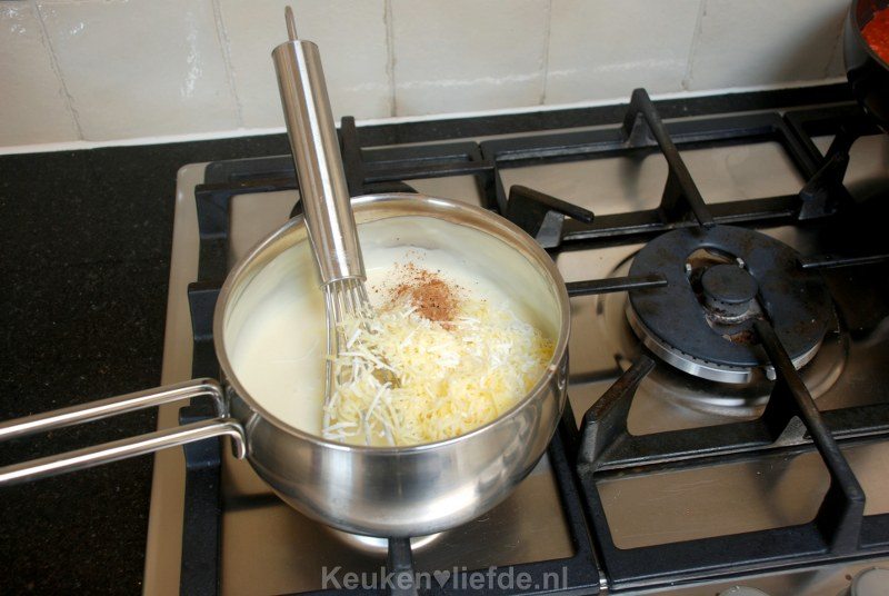 Giet tot slot de bechamelsaus erover en bestrooi met de achtergehouden geraspte kaas.
