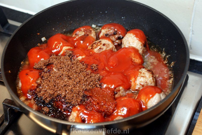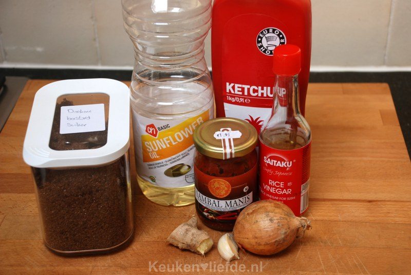 Voeg de ketchup, sambal, suiker, azijn en een scheutje water toe.