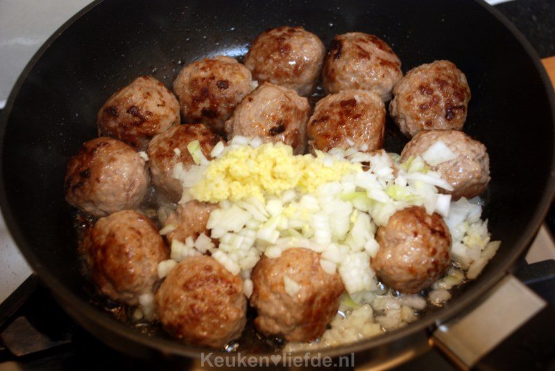 Verhit een ruime koekenpan met wat boter of olie en bak de balletjes rondom goudbruin, maar nog niet gaar. Voeg de ui, knoflook en gember toe en bak even mee totdat ze zacht zijn.