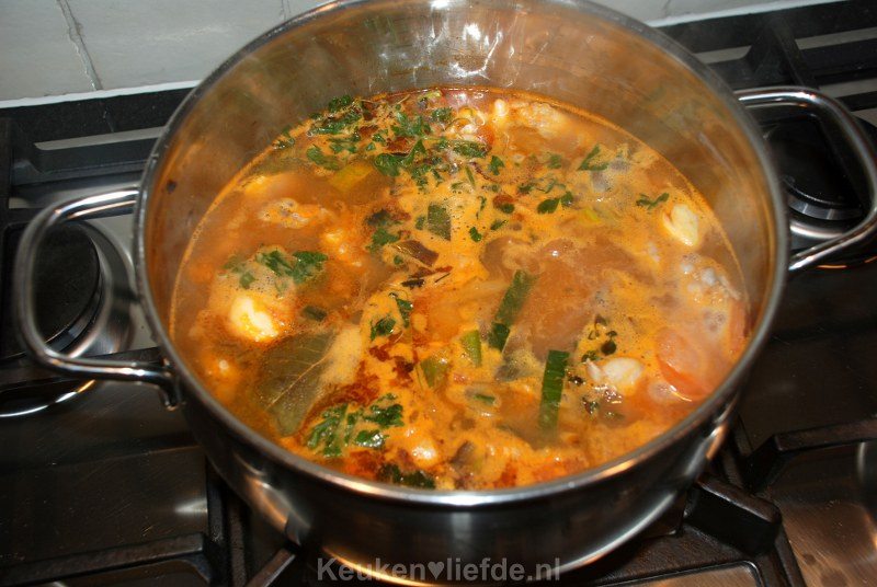 Voeg wat zout en peper toe en breng aan de kook. Zeef het schuim eraf en zet het vuur laag.
