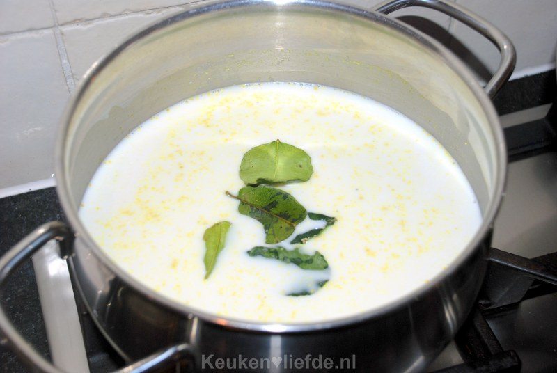 Doe de rijst in een ruime pan en voeg de kippenbouillon, kokosmelk en limoenblaadjes toe.