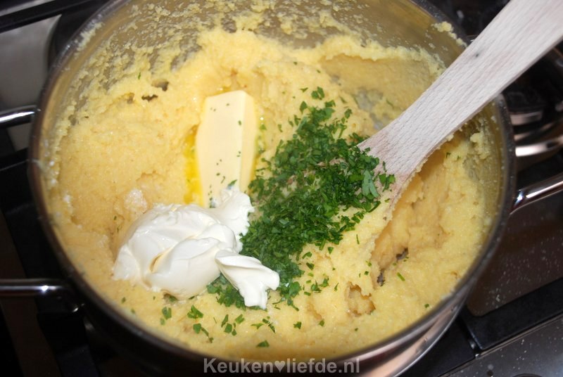 Zet het vuur direct wat zachter en roer met een garde goed door om klontjes te voorkomen. Kook de polenta in een paar minuten gaar. Het lijkt dan op dikke pap. Breng de polenta goed op smaak met de peterselie, boter, crème fraîche, Parmezaanse kaas en zout en peper.