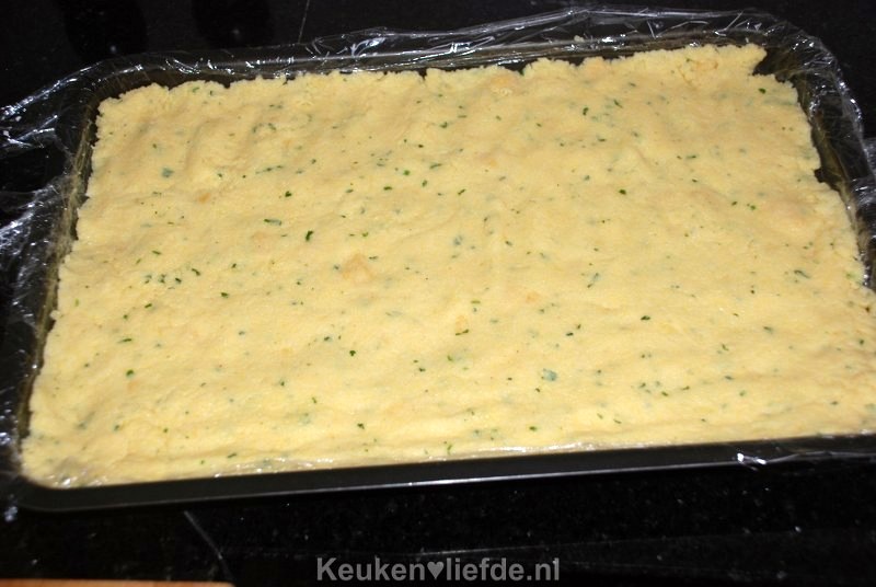 Schep de polenta erin en strijk het uit over het bakblik. Dit gaat het makkelijkste met je handen.
