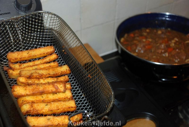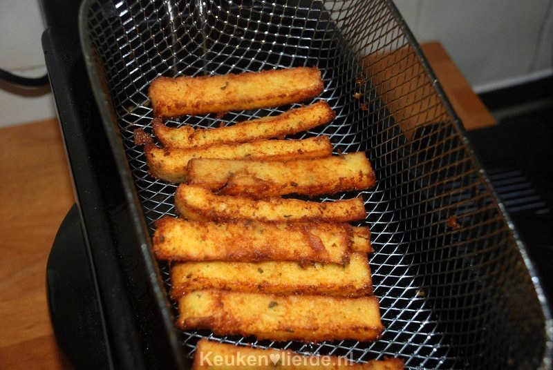 Je kunt de polenta ook bakken in de koekenpan maar frituren is makkelijker en geeft een mooier resultaat.