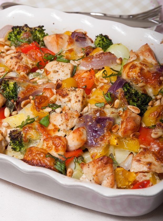 Verdeel de broccoli, kip, krieltjes, paprika en rode ui over de ovenschaal, bestrooi met zout en peper en schenk de pestoroom eroverheen. Bedek met de mozzarella. Bak 30 minuten in de oven, of totdat de kaas goudbruin is en de krieltjes zacht zijn.