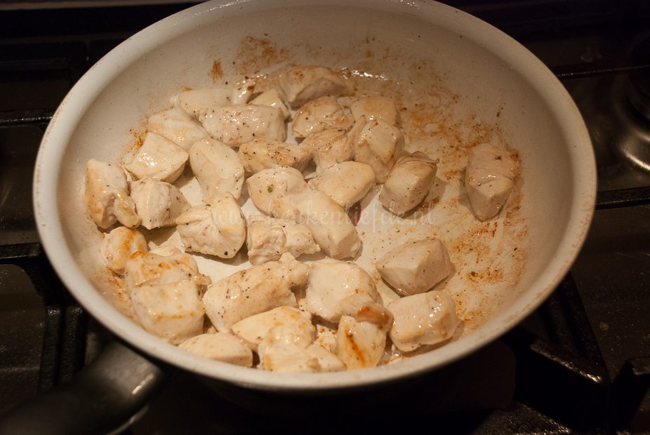 Verhit een koekenpan met wat bakboter of olie en bak de kip op hoog vuur goudbruin. Bestrooi met peper en zout. Bak de kip niet helemaal gaar, want hij gaart straks verder in de oven.