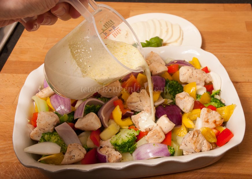 Hoi Petra, de groenten laten inderdaad vocht los tijdens het bakken. Laat de broccoli na het koken dus goed uitlekken. Je zou eventueel ook de paprika’s en ui (tegelijk met de kip) eerst even kunnen aanbakken, zodat het meeste vocht verdampt is voordat het in de ovenschotel gaat.