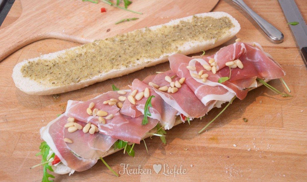 Verwarm de contactgrill. Snijd het ongebakken stokbroodje over de lengte doormidden en besmeer beide helften met 1 eetlepel pesto. Beleg een helft van het stokbrood met plakjes mozzarella, rucola, paprika, Parmaham en bestrooi met de pijnboompitten. Bedek met de andere helft van het stokbrood.