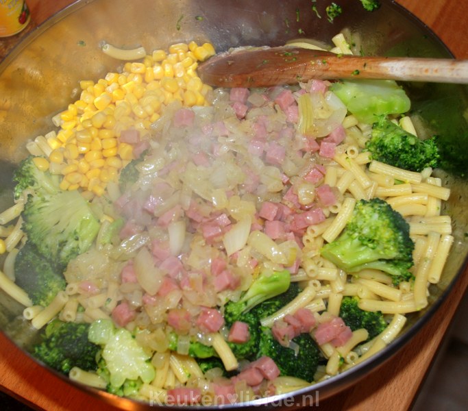 Voeg de uien, ham, uitgelekte maiskorrels en tomatenketchup toe aan de pasta en meng alles goed door elkaar.