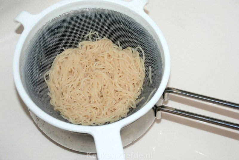 Als je vermicelli te lang meekookt, wordt het een snotterige substantie. Jakkes. Daarom kook ik de vermicelli meestal in een apart pannetje beetgaar en spoel hem daarna af met koud water om te voorkomen dat hij gaat plakken.