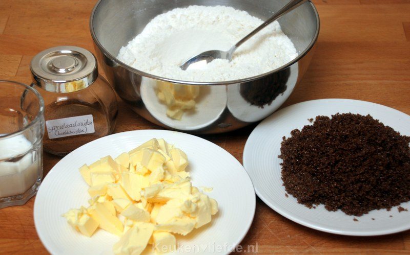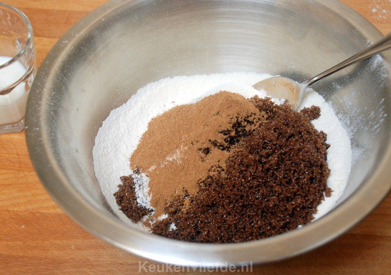 Meng het bakmeel in een grote kom met de basterdsuiker, koekkruiden en een snufje zout.
