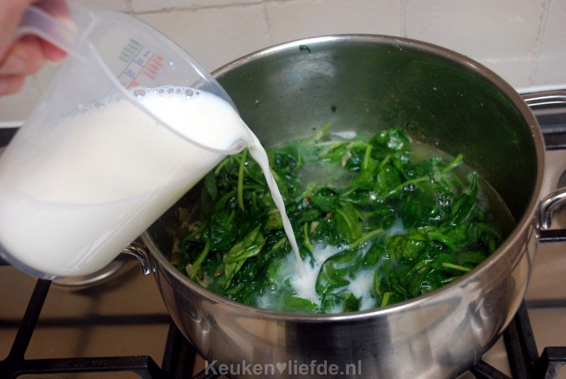 Voeg de bouillon en melk toe en laat 20 minuten zacht koken.