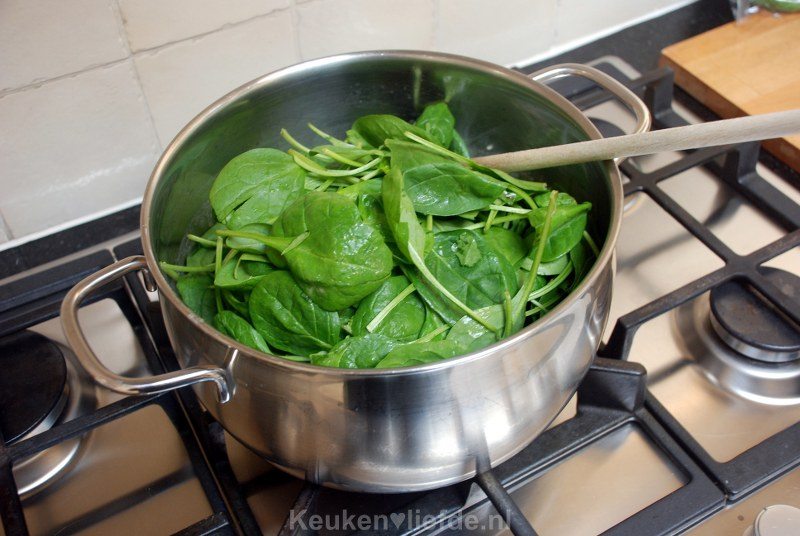 Voeg dan de spinazie en zout en peper toe en bak al roerend verder, totdat de spinazie geslonken is.