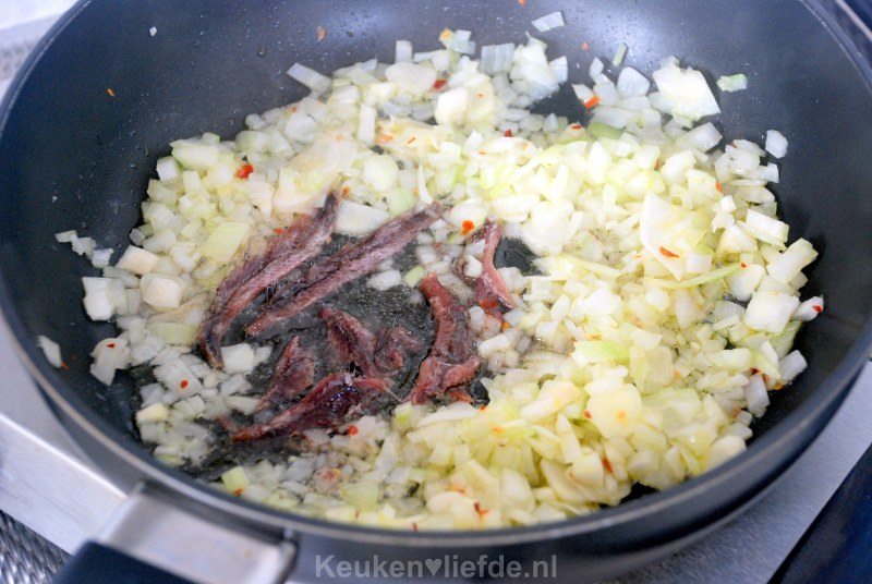 Verhit een ruime hapjespan of braadpan met wat olie en fruit op laag vuur de ui, knoflook, chilivlokken en ansjovis, totdat de uien zacht en doorzichtig zijn.