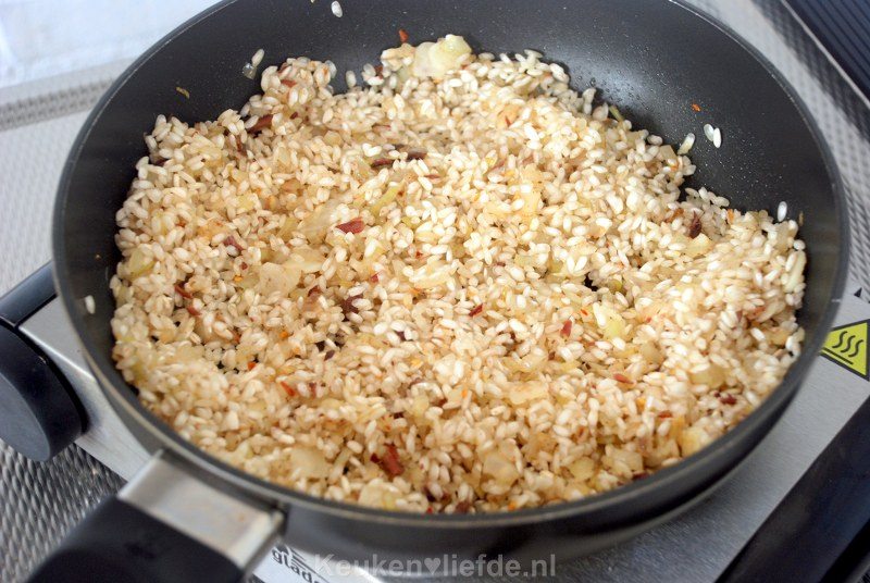 Voeg steeds opnieuw bouillon toe als het vorige bijna is opgenomen. Vergeet niet af en toe even te roeren.