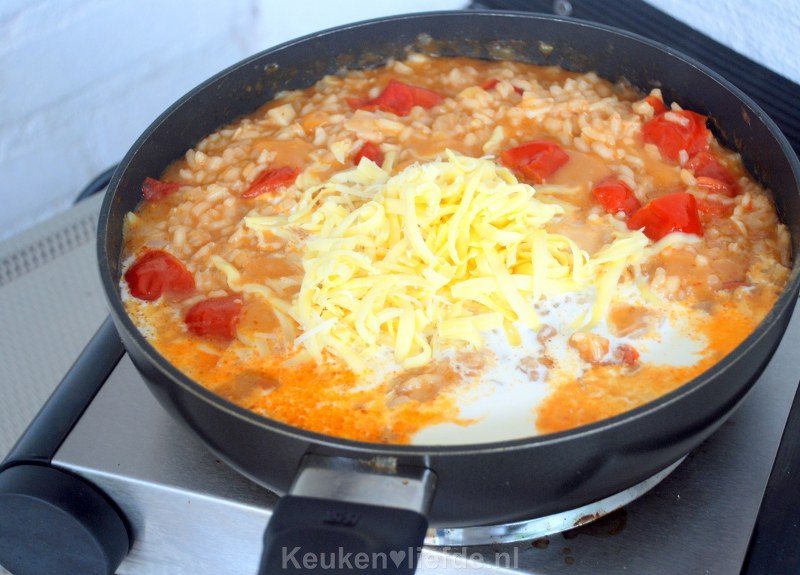 Voeg wanneer de rijst bijna gaar is en de bouillon bijna helemaal is opgenomen, de slagroom en kaas toe en roer even door.