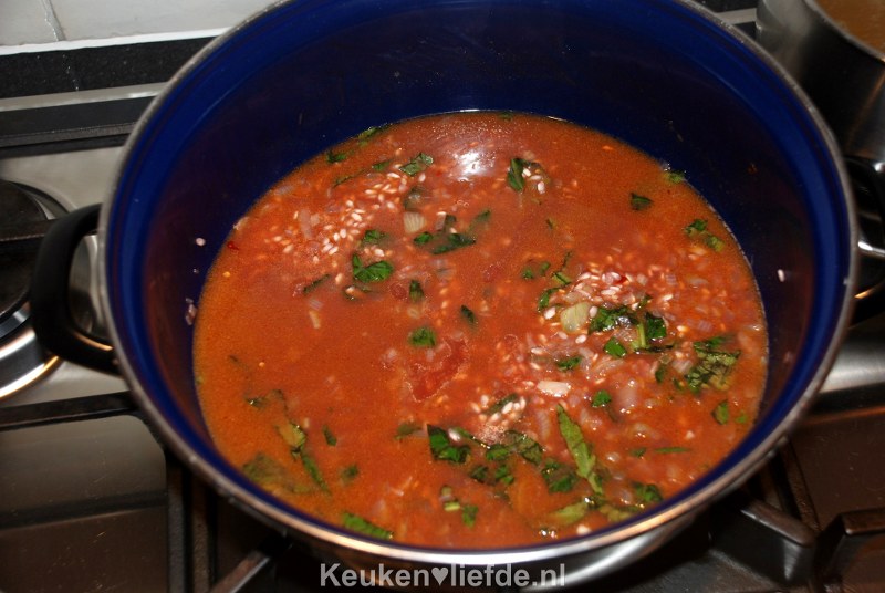 Een enkele keer als ik alleen moet eten, schotel ik mezelf dit gerecht voor. Ik nestel mezelf op de bank met een zoetsappige, tranentrekkende vrouwenfilm, schenk een goed glas rode wijn in, en eet een bord van deze dampende tomatenrisotto. Hemels!