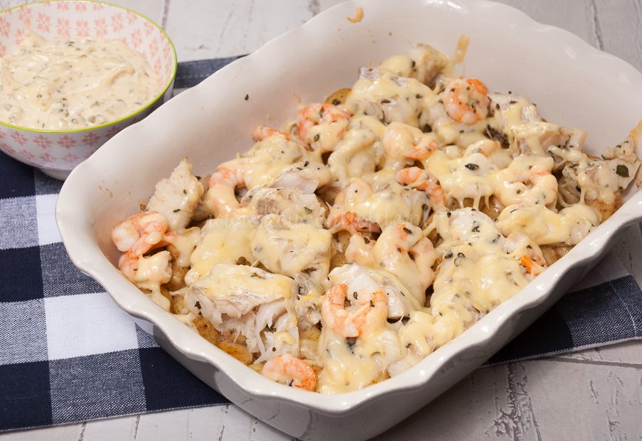 Schep de krieltjes in de ovenschaal. Verdeel de gemarineerde vis eroverheen. Bestrooi met wat zout. Verdeel de geraspte kaas erover.