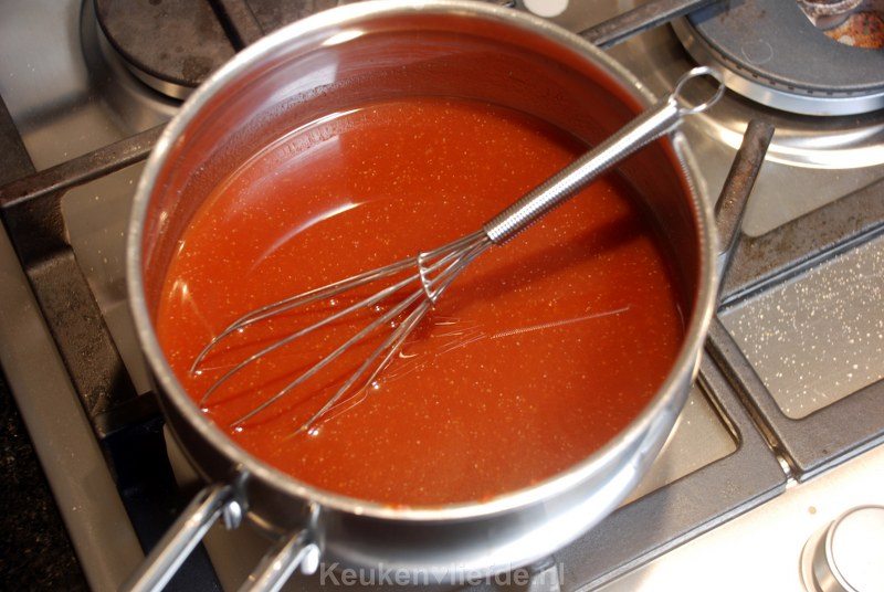 Meng ondertussen de saus ingrediënten in een steelpan (behalve de maizena) en laat enkele minuten zachtjes koken.