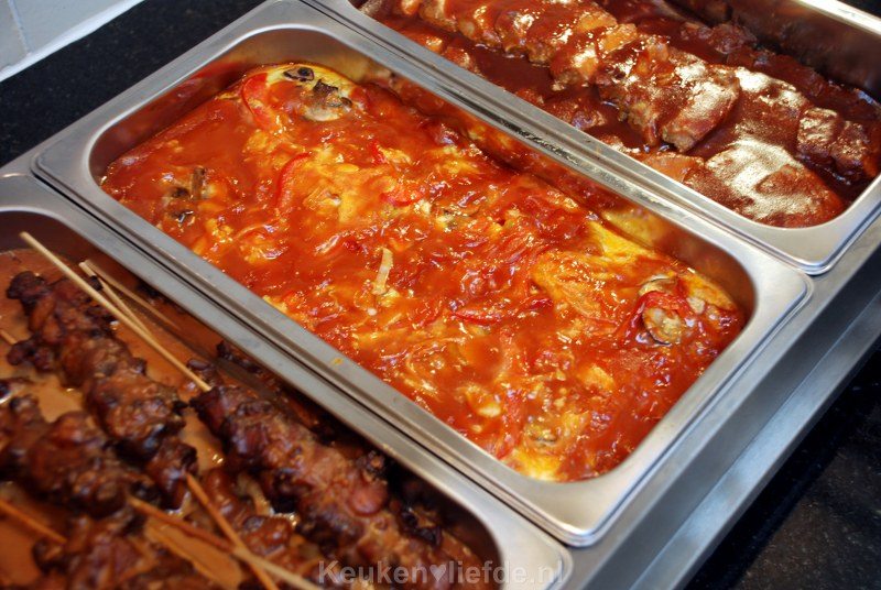 Bereid de gerechten, schep ze in de warmhoudbakken van de rechauds en laat ze helemaal afkoelen. Ik maak de meeste gerechten meestal achter elkaar, buiten in de elektrische multipan. Stukje keukenpapier door de pan halen en het volgende gerecht kan erin. Een multipan is lekker groot zodat ik het hele gerecht erin kan maken. Daarnaast vind ik het heerlijk om buiten te koken en krijg ik geen nare luchtjes – zoals bijvoorbeeld trassie! – in mijn huis.