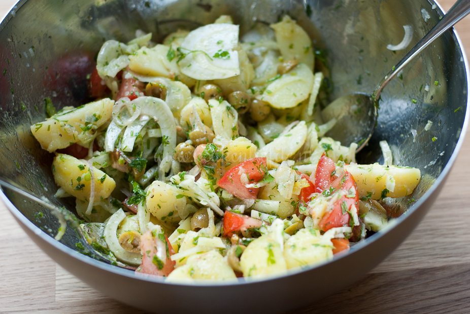 Giet de aardappels af en pel ze als ze nog heet zijn. Snijd de aardappels in kwarten en voeg toe aan de venkelsalade. Hussel voorzichtig om. Breng extra op smaak met olijfolie, citroensap, zout en peper.