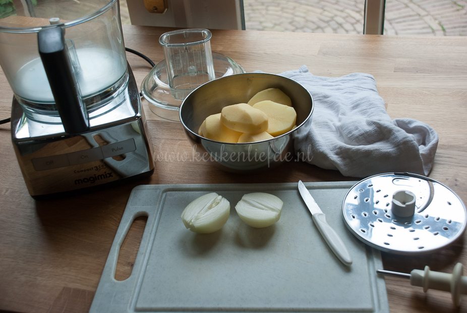 Schil de aardappels en pel de ui. Rasp ze heel fijn in de keukenmachine. (Met de hand raspen kan natuurlijk ook.) Schep de geraspte aardappels en ui in een theedoek en draai de theedoek strak dicht. Knijp zoveel mogelijk vocht uit de aardappels. Schep de aardappels en ui in een kom en meng met de bloem, het ei, knoflook, dille en breng goed op smaak met peper en zout. Meng goed door elkaar.