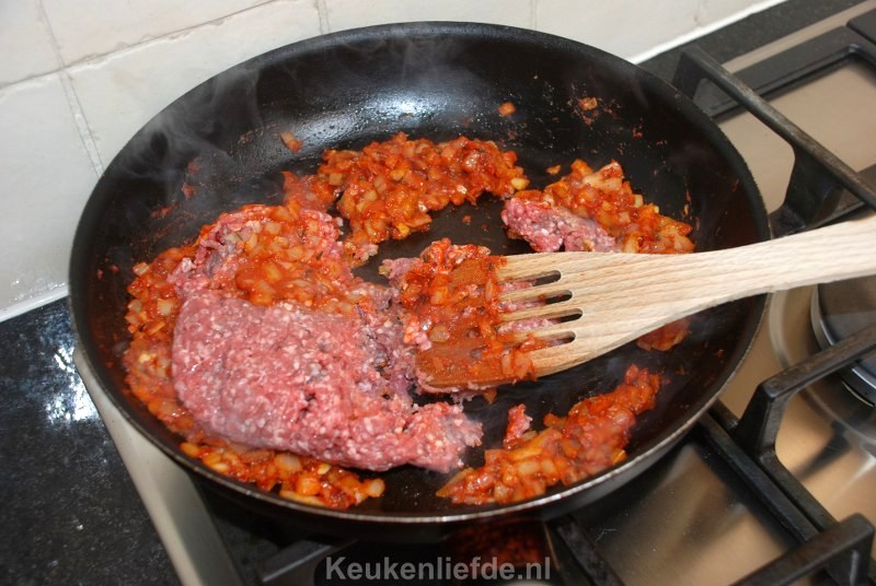 Pel en snipper de ui. Pel de knoflook en hak hem fijn. Verhit een koekenpan met wat olijfolie en fruit de ui en knoflook tot ze zacht zijn. Voeg de paprikapoeder, kruiden en tomatenpuree toe en bak even mee. Voeg dan het gehakt toe en roer goed los.
